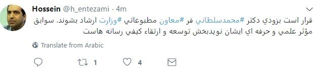 به گزارش با خبرنگار اجتماعی باشگاه خبرنگاران پویا؛ حسین انتظامی، معاون مطبوعاتی وزیر فرهنگ و ارشاد اسلامی دقایقی پیش با انتشار توییتی نوشت: قرار است بزودی دکتر محمد سلطانیفر معاون مطبوعاتی وزارت ارشاد بشوند؛ سوابق مؤثر علمی و حرفهای ایشان نویدبخش توسعه و ارتقاء کیفی رسانههاست.