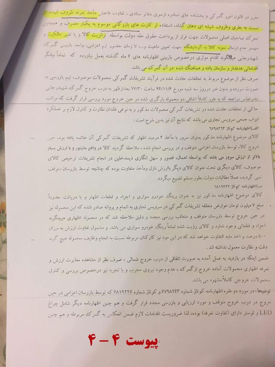 2- در خصوص پرونده 1128 کانتینر ظروف کریستال نیز گمرک در جوابیه نوشته [که قبلاً دفتر بازرسی گمرک به آن ورود کرده و نسبت به پیگیری روند قانونی اقدام نموده و بحث جدیدی نیست 1128 کانتینر کالای قاچاق اصلاً وجود ندارد و همان مرجع نظارتی نیز رسماً این موضوع را پذیرفته است] و به همین آسانی موضوع قاچاق 1128 کانتینر ظروف شیشه‌ای را مانند دستگاه‌های بیهوشی می‌بندند. (پیوست 4)