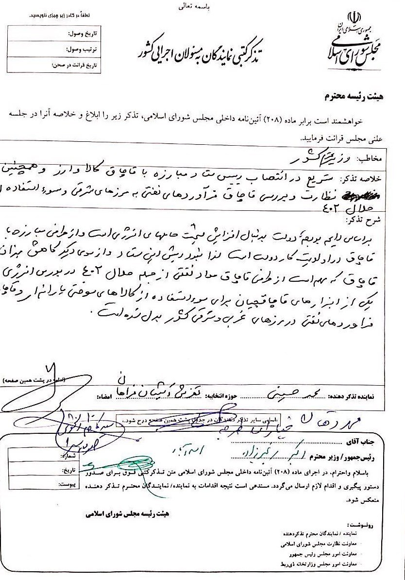 در این تذکر خطاب به وزیر کشور ضمن تاکید بر تسریع انتصاب رئیس جدید ستاد مبارزه با قاچاق کالا و ارز بر نظارت و بررسی قاچاق فرآوردههای نفتی به مرزهای شرقی و سو استفاده از حلال 402 تاکید شده است.