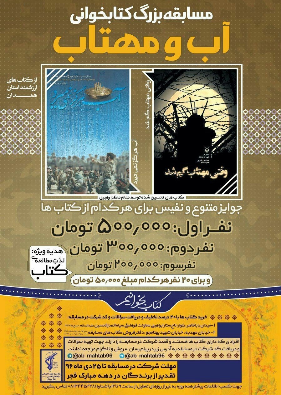 به گزارش خبرگزاری تسنیم از همدان، به همت معاونت فرهنگی و اجتماعی سپاه انصارالحسین(ع) همدان مسابقه بزرگ کتابخوانی دو اثر تحسین شده " آب هرگز نمیمیرد" و "وقتی مهتاب گم شد" با عنوان" آب و مهتاب" به قلم توانای حمید حسام در همدان برگزار میشود.