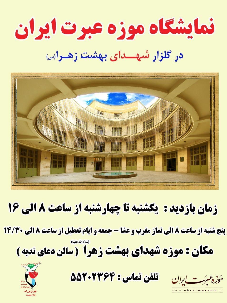 اکبری در خصوص زمان بازدید از نمایشگاه موزه عبرت عنوان کرد: این نمایشگاه یکشنبه تا چهارشنبه از ساعت 8 صبح الی 16 و روزهای پنج شنبه از ساعت 8 صبح الی نماز مغرب و عشا و نیز روز جمعه و ایام تعطیل از ساعت 8 صبح الی 14/30 میزبان عموم مردم است.