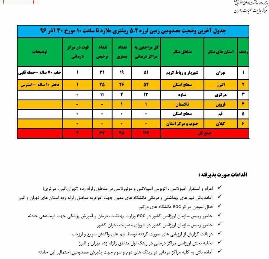 براساس این مرکز، تعداد کل مراجعه کنندگان به مراکز درمانی در استان تهران(مناطق شهریار و رباط کریم) حدود 51 نفر گزارش شده که از این تعداد 19 نفر بستری و 31 نفر ترخیص شدهاند که متاسفانه یک نفر خانم 70 ساله هم بر اثر سکته قلبی جان باخته است.