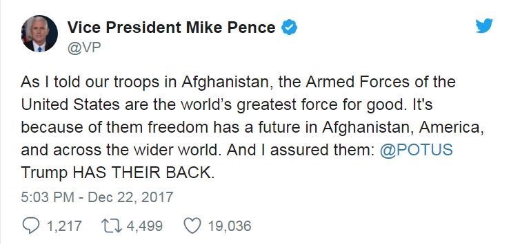 پنس پس از این دیدار نیز در توئیتی بر حمایت ترامپ از نظامیان آمریکایی در افغانستان نیز تاکید کرد.