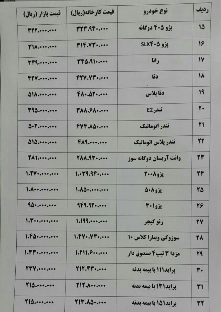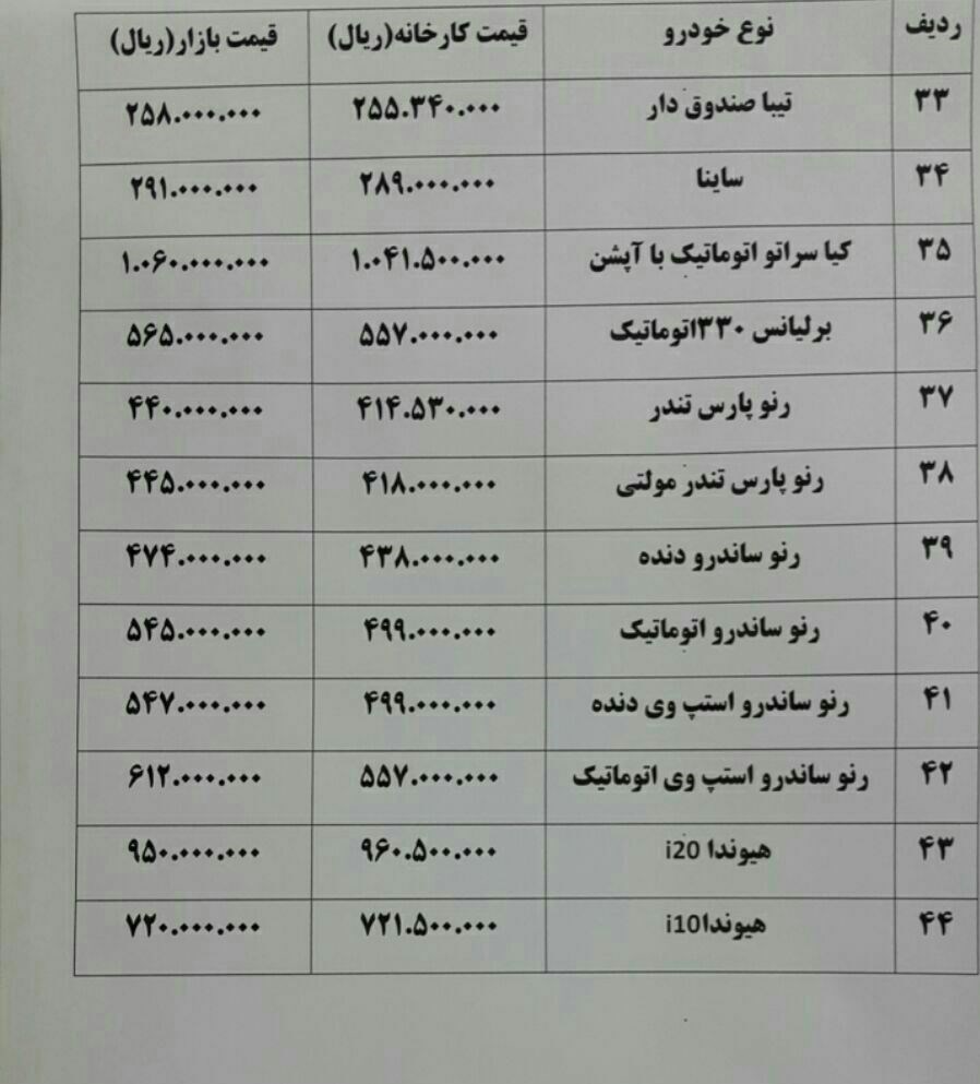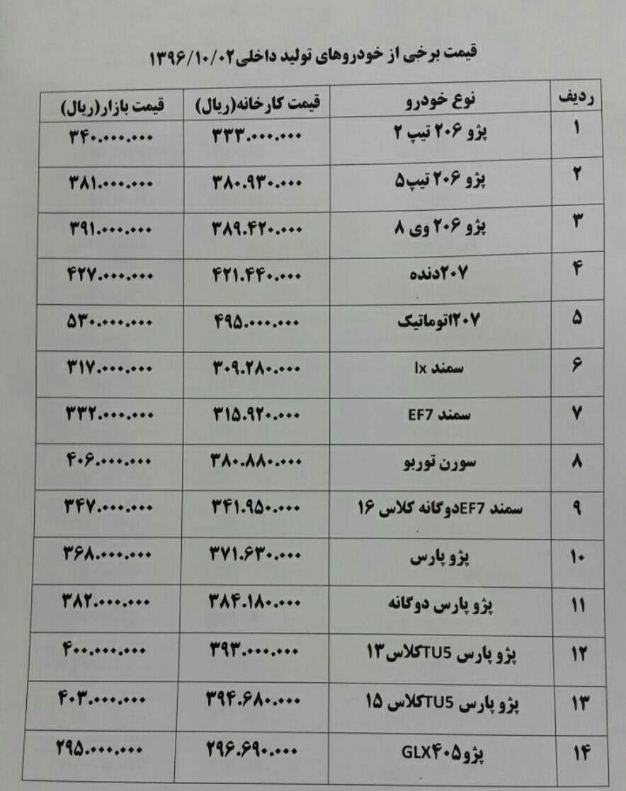 قیمت انواع خودروهای داخلی در بازار امروز بهشرح زیر است:
