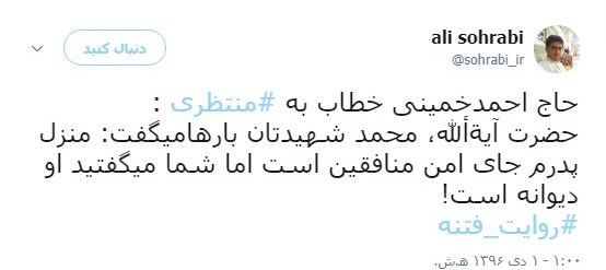 حاج احمد خمینی خطاب به منتظری: حضرت آیت الله، محمد شهیدتان بارها میگفت: منزل پدرم جای امن منافقین است اما شما میگفتید او دیوانه است!