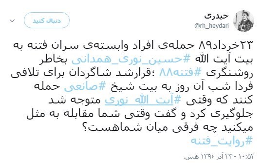 گروه احزاب خبرگزاری تسنیم قصد دارد از این پس تا سالروز یوم الله 9 دی، هر روز برخی از توییتهای جالب این کمپین را منتشر کند. در ذیل، تعدادی از توییتهای مردم و فعالان فضای مجازی با هشتگ #روایت_فتنه را مشاهده میکنید:
