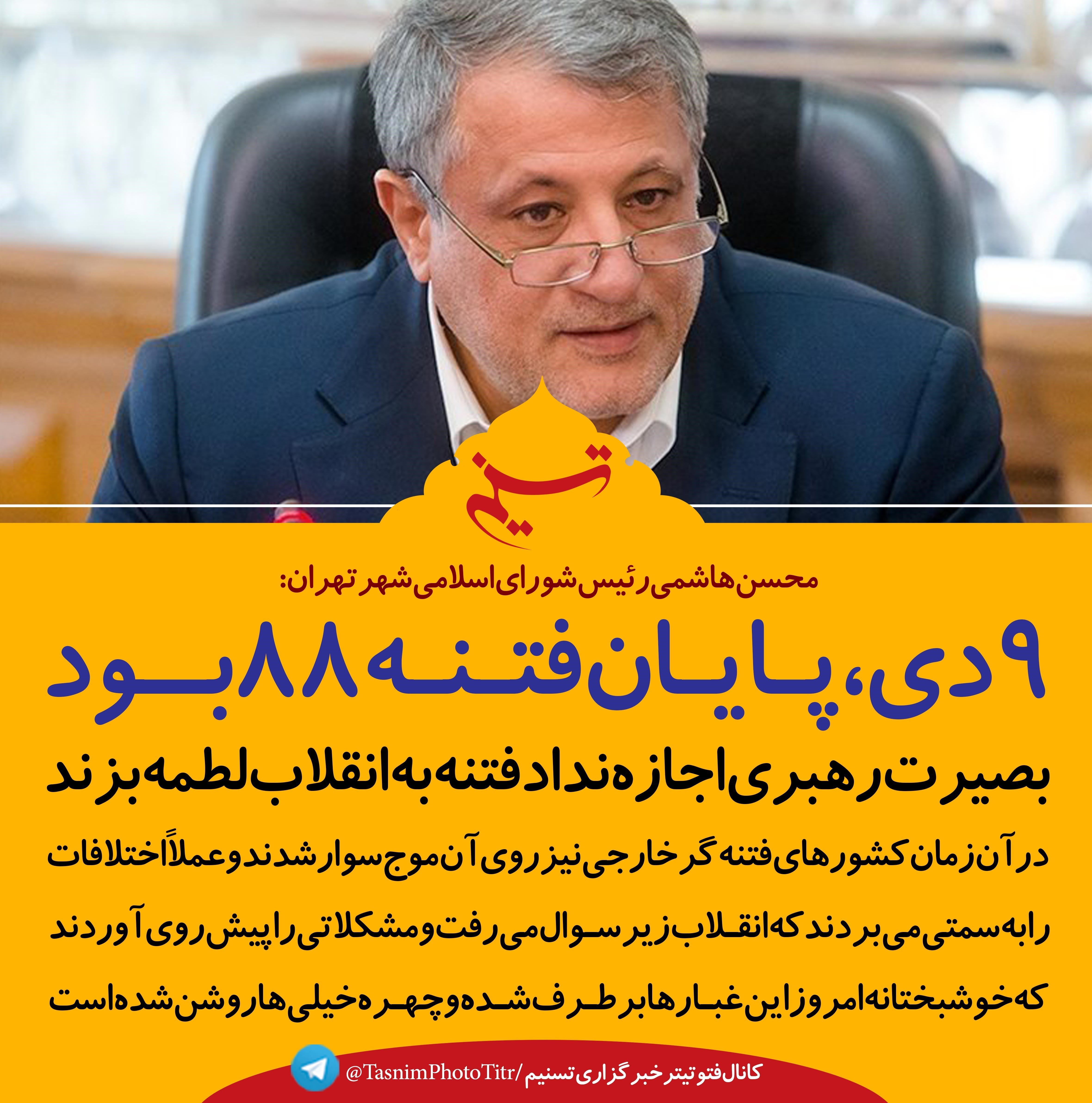 رئیس شورای شهر تهران با اشاره به اعتراضات برخی از افراد در انتخابات سال 88 گفت: با بصیرت و راهنمایی‌های مقام معظم رهبری فتنه سرکوب و موقعیت‌سنجی مردم موجب شد اختلافات لطمه‌ای به انقلاب نزند.