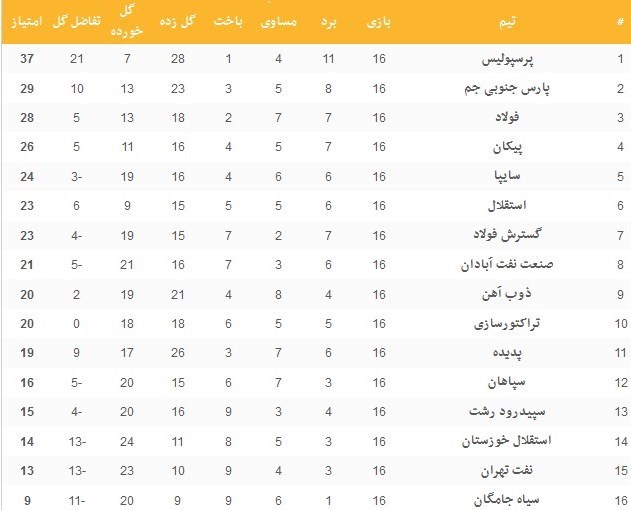نتایج کامل بازیهای هفته شانزدهم لیگ برتر به شرح زیر است: