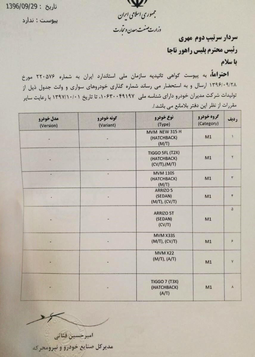 شایان ذکر است طبق اطلاعات ضمیمه کلیه محصولات شرکت مدیران خودرو در دو برند امویام و چری دارای کلیه استانداردهای لازم بوده و پلاک میگردند".