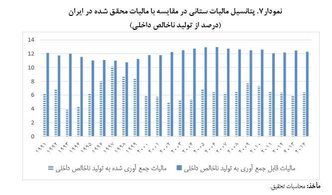 نمودار زیر را ببینید. به عبارت دقیق‌تر، طی بیش از دو دهه، متوسط تلاش مالیاتی (به معنای نسبت مالیات جمع‌آوری شده به میزان قابل جمع‌آوری) حدود 54 درصد بوده است.