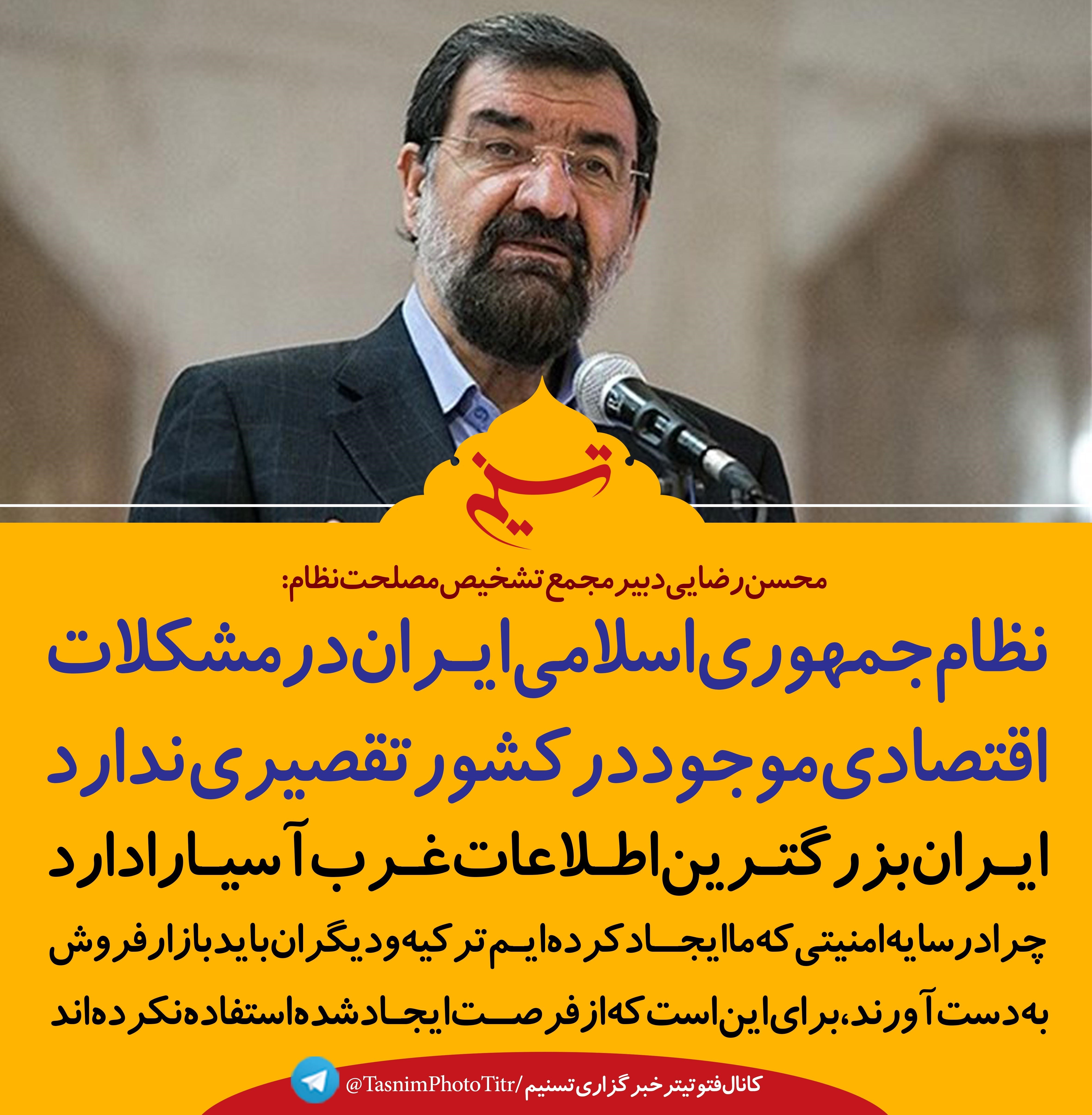 فتوتیتر/محسن رضایی:نظام جمهوری اسلامی ایران در مشکلات اقتصادی موجود در کشور تقصیری ندارد