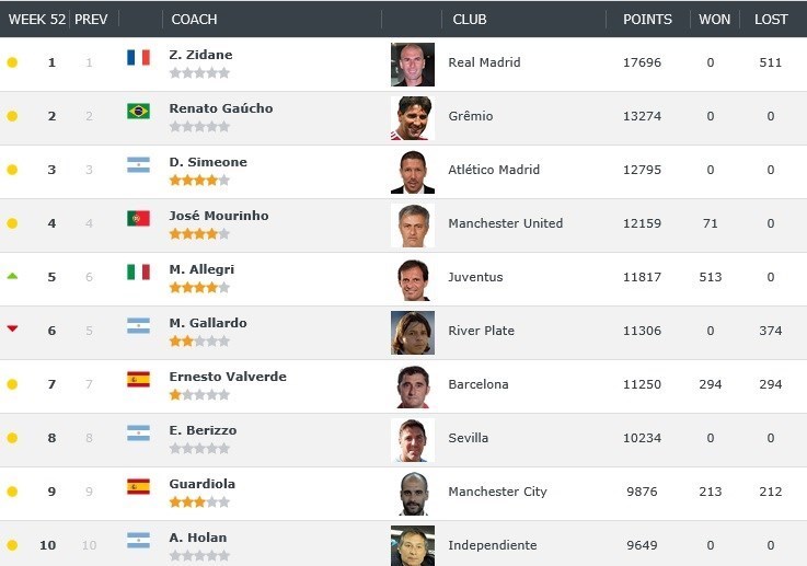در ردهبندی مربیان جهان زینالدین زیدان، سرمربی رئال مادرید با 17 هزار و 696 امتیاز در صدر ایستاده است. رناتو گائوچو، سرمربی گرمیوی برزیل با 13 هزار و 274 امتیاز دوم است و دیهگو سیمئونه، سرمربی اتلتیکومادرید نیز با کسب 12 هزار و 795 امتیاز جایگاه سوم را به خود اختصاص داده است.