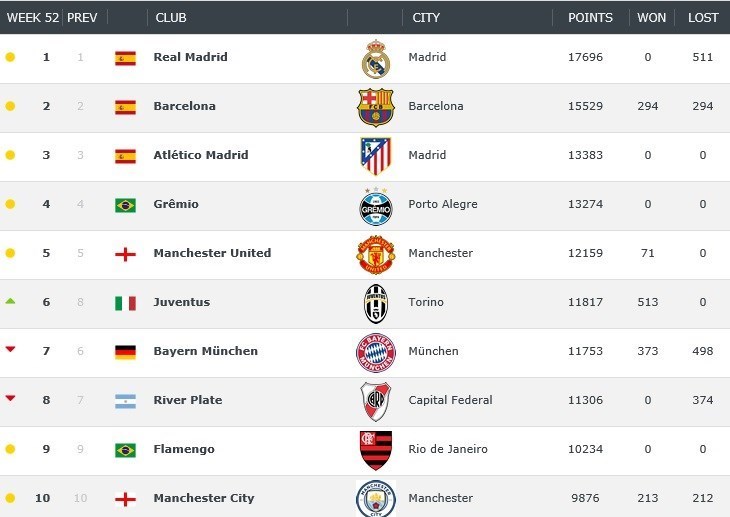 به گزارش خبرگزاری تسنیم، سایت «clubworldranking» تازهترین ردهبندی برترین باشگاههای جهان را اعلام کرد که بر این اساس رئال مادرید همچنان با 17 هزار و 696 امتیاز در صدر این ردهبندی قرار دارد و بارسلونا با 15 هزار و 529 امتیاز و اتلتیکومادرید با 13 هزار و 383 امتیاز نیز بهترتیب در ردههای دوم و سوم هستند.