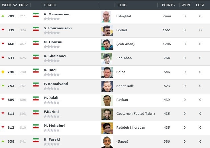 برانکو ایوانکوویچ بین مربیان لیگ برتر ایران صاحب بهترین جایگاه است. سرمربی کروات پرسپولیس با کسب 3298 امتیاز و با یک پله صعود در مکان صد و سی و نهم جهان قرار گرفت. علیرضا منصوریان، سرمربی پیشین استقلال با دو پله صعود در رده دویستونهم قرار گرفته است و پورموسوی، سرمربی فولاد نیز با کسب 1661 امتیاز و سقوط 15پلهای در مکان سیصد و سی و نهم جای دارد. منصوریان و پورموسوی بهترتیب دومین و سومین مربی برتری این ردهبندی هستند.
