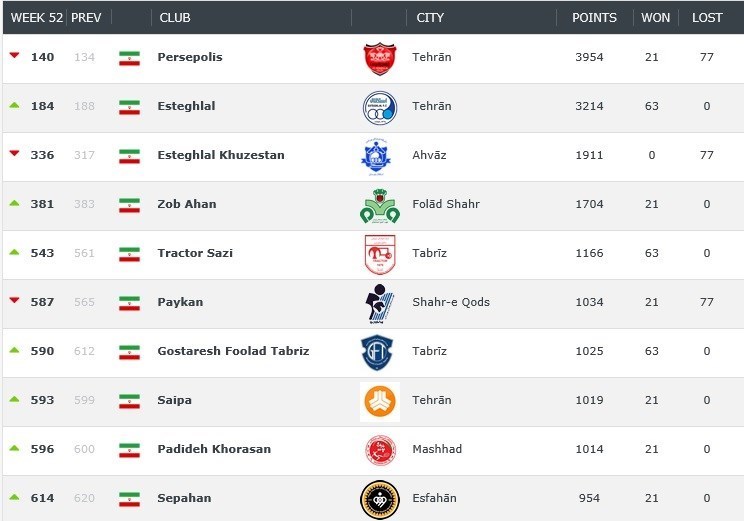 پرسپولیس با 3954 امتیاز و 6 پله سقوط در رده صد و چهلم جهان جای دارد و بین تیمهای ایرانی صاحب بهترین جایگاه است. استقلال نیز با چهار پله صعود در رده صد و هشتاد و چهار قرار گرفته و دومین تیم برتر ایرانی این ردهبندی است. استقلال خوزستان با 19 پله سقوط در رده سیصد و سی و ششم ایستاده و بین تیمهای ایرانی صاحب جایگاه سوم است.