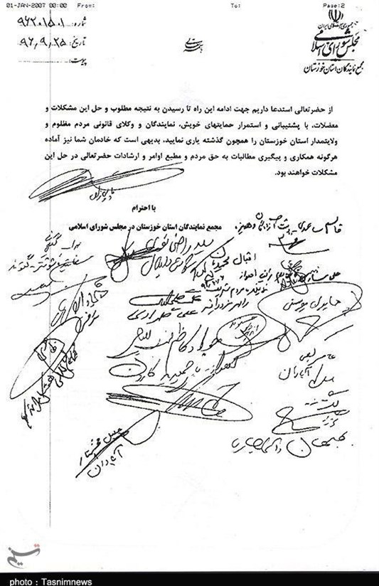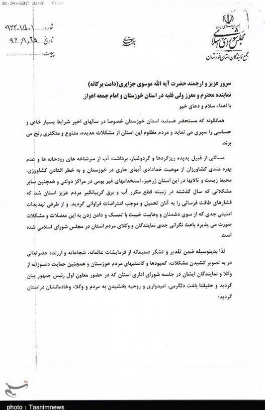 تصویر نامه مجمع نمایندگان استان خوزستان در مجلس شورای اسلامی به آیتالله موسویجزایری در زیر آمده است: