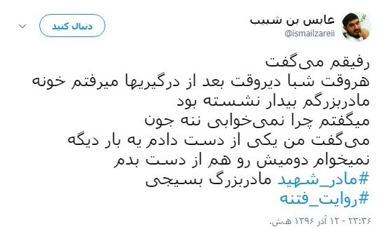 رفیقم میگفت هر وقت شبا دیروقت بعد از درگیریها میرفتم خونه مادر بزرگم بیدار نشسته بود میگفتم چرا نمیخوابی ننه جون میگفت من یکی از دست دادم یه بار دیگه نمیخوام دومیش رو هم از دست بدم مادر شهید مادربزرگ بسیجی.