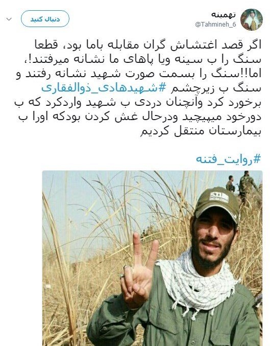 اگر قصد اغتشاشگران مقابله با ما بود، قطعا سنگ را به سینه و یا پاهای ما نشانه می رفتند اما سنگ را بهسمت صورت شهید نشانه رفته بودند و سنگ به زیر چشم شهید هادی ذوالفقاری برخورد کرد و آنچنان دردی به شهید وارد کرد که بهدور خود می پیچید و در حال غش کردن بود که او را به بیمارستان منتقل کردیم.