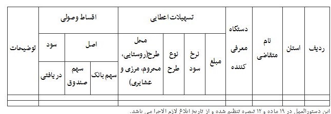 - برای سایر طرح ها، تسهیلات موصوف با نرخ 4 درصد به مناطق روستایی مرزی و عشایری مرزی و 6 درصد به روستاهای غیر مرزی و عشایری غیر مرزی به متقاضی پرداخت می شود.