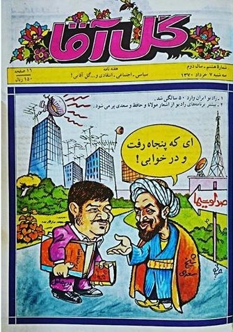 زمانی که آقای محمد هاشمی ریاست صداوسیما را بر عهده داشت بسیاری از برنامههای رادیو و تلویزیون با اشعار حافظ، سعدی، فردوسی و مولانا پُر میشد و من در کاریکاتوری این شاعران را در حالی کشیدم که در صف حقوقِ صداوسیما هستند. زمانی که سالگرد پنجاهسالگی رادیو را جشن گرفتند یک طرح روی جلد داشتم که در آن محمد هاشمی در حالی که کتابهای حافظ و مولانا را زیر بغل دارد روبروی سعدی ایستاده است و سعدی به او میگوید: «ای که پنجاه رفت و در خوابی» و شکل و لباسهای سعدی را به حالت امروزی کشیده بودم.