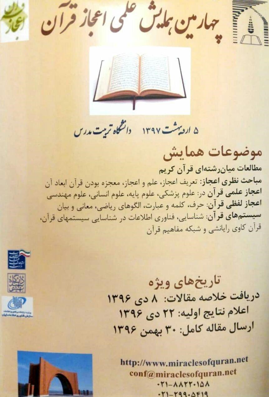 به گزارش تسنیم، همایش علمی اعجاز قرآن از سوی انجمن علمی اعجاز قرآن و با همکاری دانشگاه تربیت مدرس و دانشگاه شهید بهشتی با موضوعاتی در قالب مطالعات میان رشتهای قرآن کریم شامل مباحث نظری اعجاز که در این بخش تعریف اعجاز، علم اعجاز و معجزه بودن قرآن و ابعاد آن مورد بررسی قرار میگیرد، اعجاز علمی قرآن که شامل موضوعهای علوم پزشکی، علوم مهندسی، علوم پایه و علوم انسانی است، اعجاز لفظی قرآن که شامل حرف، عبارت، الگوهای ریاضی، کلمه، معانی و بیان است و در نهایت بخش سیستمهای قرآن که شامل شناسایی، فناوری اطلاعات در شناسایی سیستمهای قرآن، قرآن کاوی رایانشی و شبکه مفاهیم قرآن است.