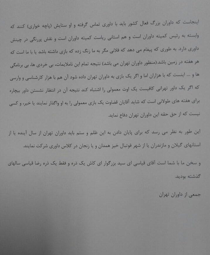 در این رابطه داوران تهرانی در نامهای به کمیته داوران به انتقاد از وضعیت داوران تهرانی پرداختهاند که این نامهها را میتوانید در زیر مشاهده کنید:
