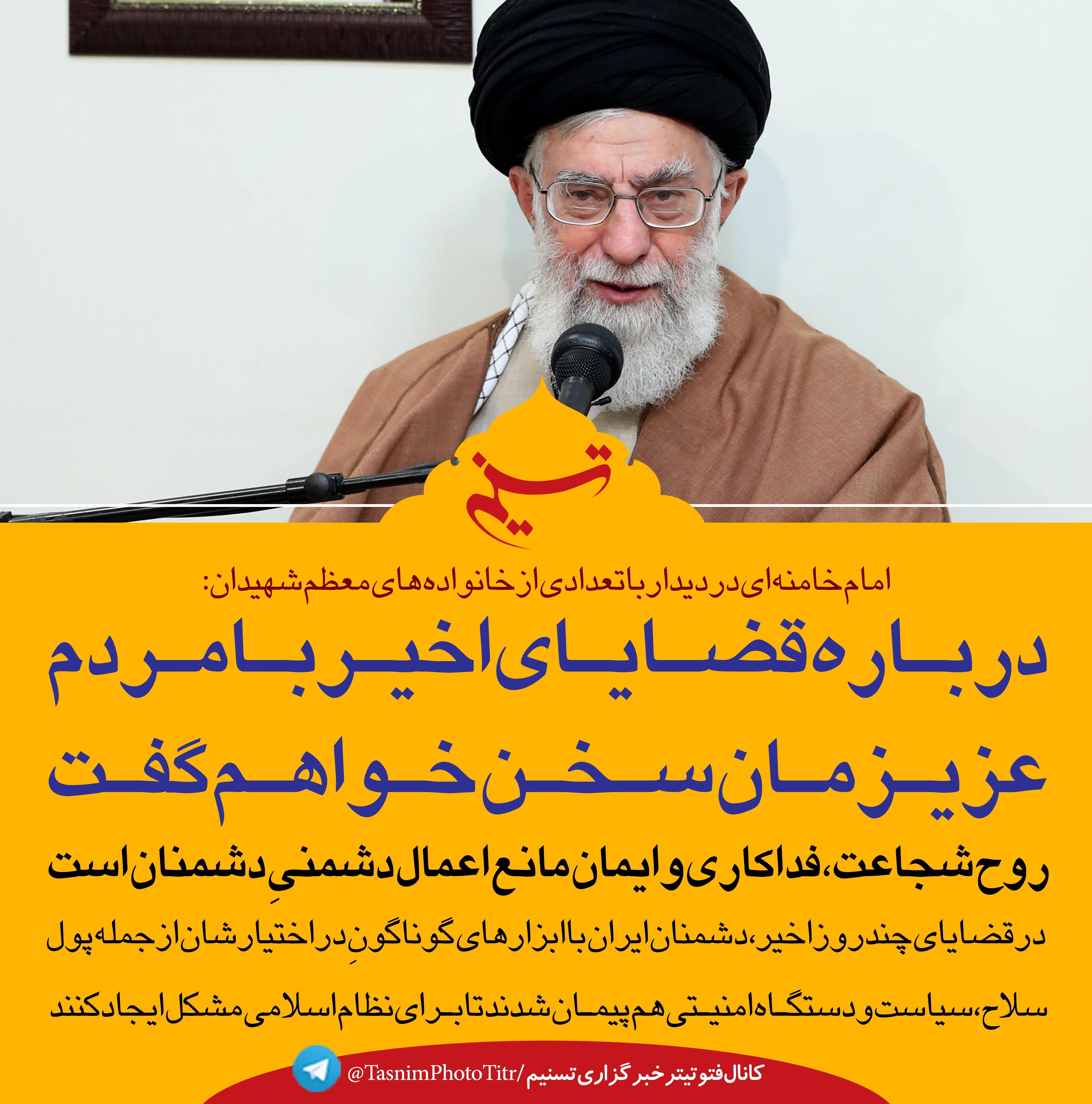 حضرت آیت الله خامنه‌ای فرمودند: در قضایای چند روز اخیر، دشمنان ایران با ابزارهای گوناگونِ در اختیارشان از جمله پول، سلاح، سیاست و دستگاه امنیتی هم‌پیمان شدند تا برای نظام اسلامی مشکل ایجاد کنند.