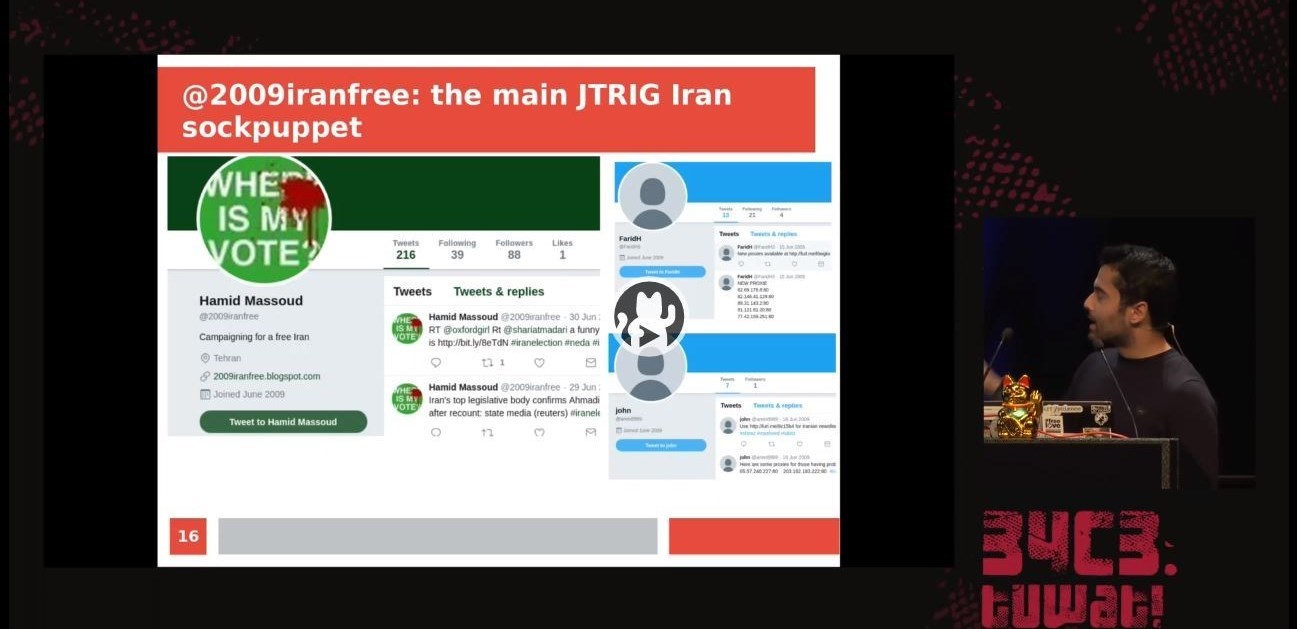 این محقق مسائل امنیتی در «کنفرانس ارتباطات کیآس» تصریح کرد این حسابهای توئیتر و وبسایتها در جریان حوادث مربوط به ناآرامیهای سوریه در سال 2011 (1389) و اغتشاشات پس از انتخابات ریاستجمهوری ایران در سال 2009 (1388) نقش فعالی ایفا کردهاند.