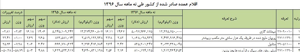 در این بین فرآورده های نفتی در صدر کالاهای صادراتی کشور قرار گرفته اند و بر این اساس به غیر از میعانات گازی، پروپان مایع شده، متانول و روغنهای سبک به جز بنزین در ردههای بعدی قرار گرفته اند.