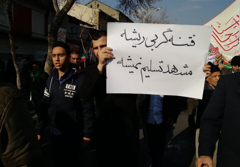 مرگ بر منافق، مرگ بر آمریکا و حیدریام حیدری، مطیع امر رهبری از جمله شعارهای مردم مشهد در راهپیمایی امروز مردم مشهد است.