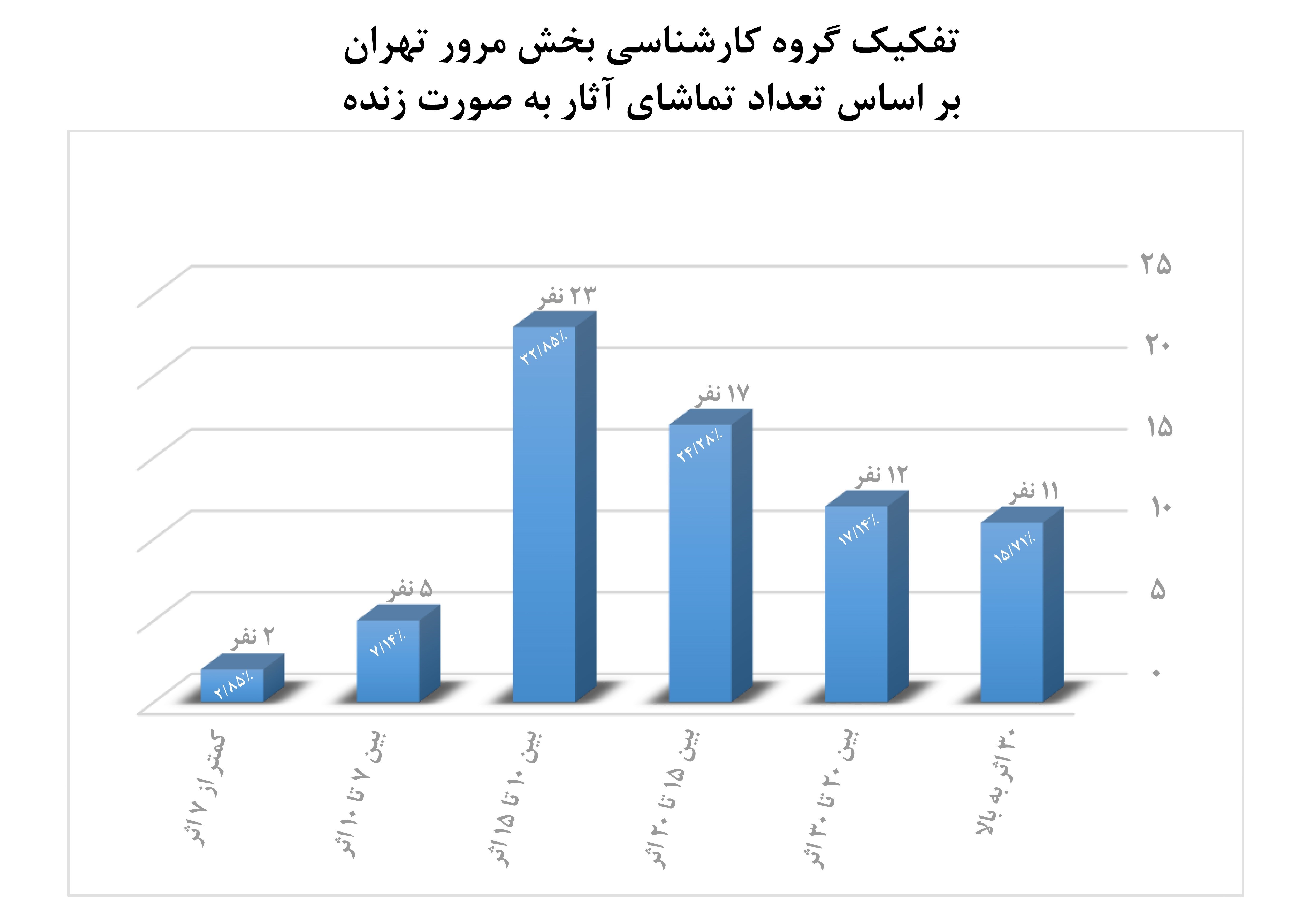 نمودار دوم اما واقعیت تلخی را نشان میدهد. اگر فرض کنیم یک شخصیت درگیر تئاتر بتواند هفتهای یکبار به دیدن نمایش برود - به خصوص آنکه هیئت 70نفری عموماً میهمان نمایشها میشوند - در مجموعه افراد میتواند در طی یک سال 52 نمایش تماشا کنند. تنها 11 نفر از 70 نفر بیش از 30 اثر دیدهاند و این نکته را باید در نظر گرفت ما نمیدانیم این بالای 30 نمایش در بهترین حالت چند نمایش بوده است. در مقابل نزدیک 85درصد از افراد کمتر از 30 نمایش دیدهاند. این نکته را مدنظر قرار دهیم که آثار حاضر در بخش مرور - با توجه به آثار انتخاب شده در بخش میهمان - عموماً نمایشهای مهجور در بازار تئاتر تهران بودهاند و این به معنای مهم نبودن این آثار از دید گروه انتخاب است. اگر ملاک دیدن 20 اثر را به بالا بدانیم باز وضعیت آماری خوب نیست. 67درصد از افراد کمتر از 20 نمایش دیدهاند و با توجه به وضعیت نمودار این گروه اکثریتی - گروه 10 تا 15 نمایش - شاید باید به این فکر کرد مکانیزم موجود نیاز به بهسازی نمایش دیدن گروه انتخاب است.