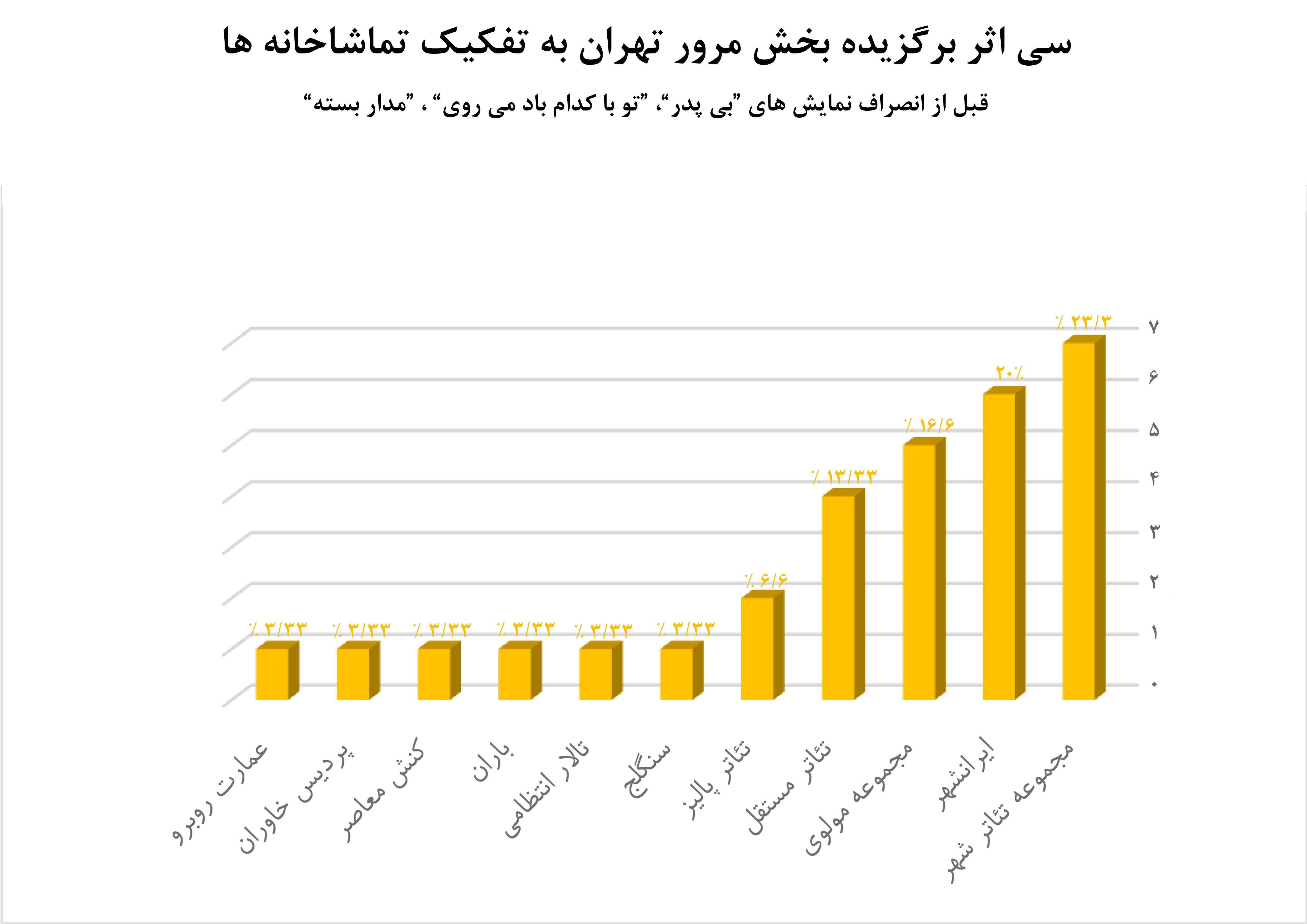نمودار بعدی اثرگذاری تبلیغات بر جذب تئاتریها را نشان میدهد. با وجود اختلاف بالای تئاتر شهر در تعداد آرا نسبت به ایرانشهر، این مهم در تعداد آثار جبران میشود. بازگشت و احیای ایرانشهر از این منظر نشان میدهد اسامی در جلب نظر افراد برای تماشای اثر قابل اهمیت است و تئاتریها نیز همانند عموم مخاطبان به اسامی نگاه میکنند.