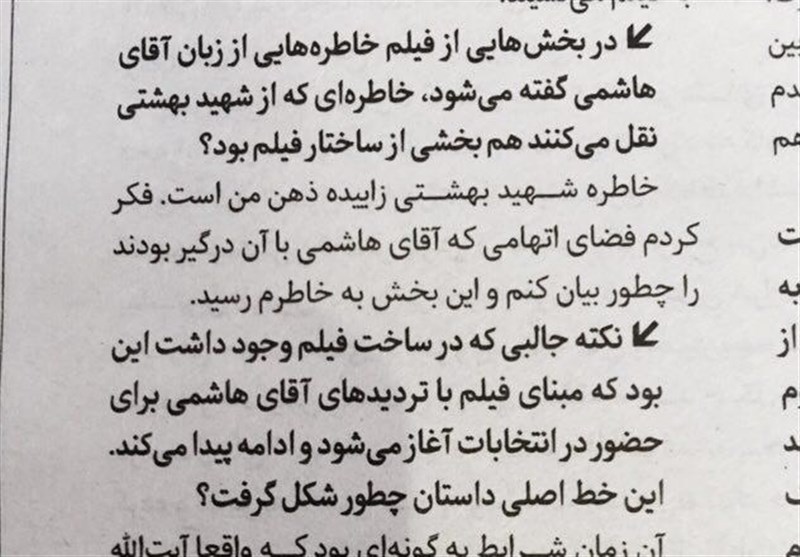 منوچهر محمدی تهیهکننده فیلم تبلیغاتی آیتالله هاشمی در سال 84، امروز گفتگویی با روزنامه شرق انجام داده و گفته است که این خاطره "زاییده ذهن او" بوده است. محمدی در پاسخ به این سوال که "در بخشهایی از فیلم خاطرههایی از زبان آقای هاشمی گفته میشود، خاطرهای که از شهید بهشتی نقل میکنند هم بخشی از ساختار فیلم بود؟" میگوید: "خاطره شهید بهشتی زاییده ذهن من است. فکر کردم فضای اتهامی که آقای هاشمی با آن درگیر بودند را چطور بیان کنم و این بخش به خاطرم رسید."