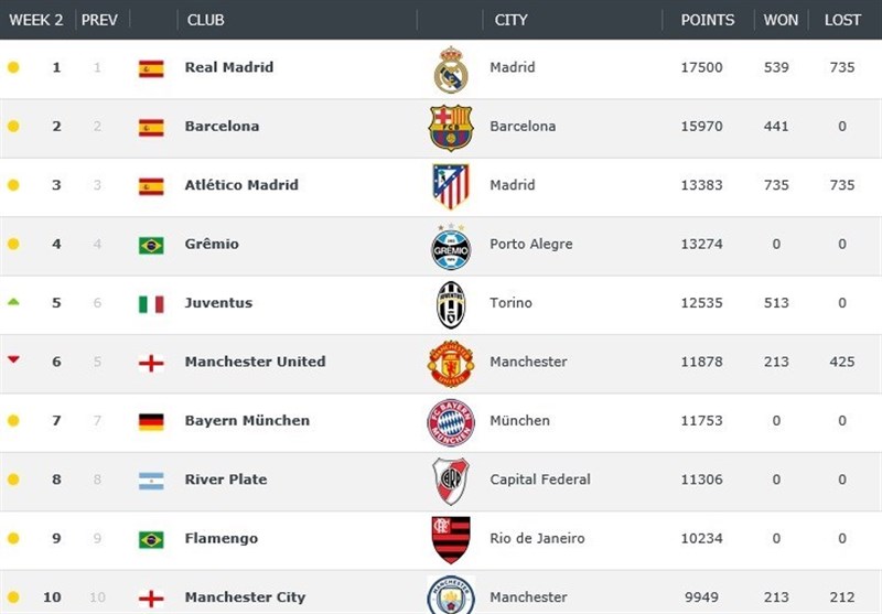 در بین تیمهای باشگاهی، رئال مادرید (17 هزار و 500 امتیاز)، بارسلونا (15 هزار و 970 امتیاز) و اتلتیکو مادرید (13 هزار و 383 امتیاز) ردههای اول تا سوم را به خود اختصاص دادهاند.