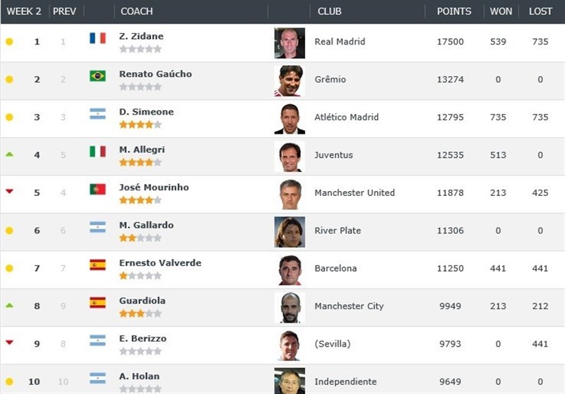به گزارش خبرگزاری تسنیم، سایت «Clubworldranking» تازهترین ردهبندی برترین مربیان رده باشگاهی جهان را اعلام کرد که بر این اساس زینالدین زیدان، سرمربی رئال مادرید با کسب 17 هزار و 500 امتیاز همچنان برترین مربی این ردهبندی است. رناتو گائوچو سرمربی گرمیوی برزیل هم با کسب 13 هزار و 274 امتیاز در مکان دوم جای دارد و دیهگو سیمئونه سرمربی اتلتیکو مادرید هم با کسب 12 هزار و 795 امتیاز جایگاه سوم را به خود اختصاص داد.