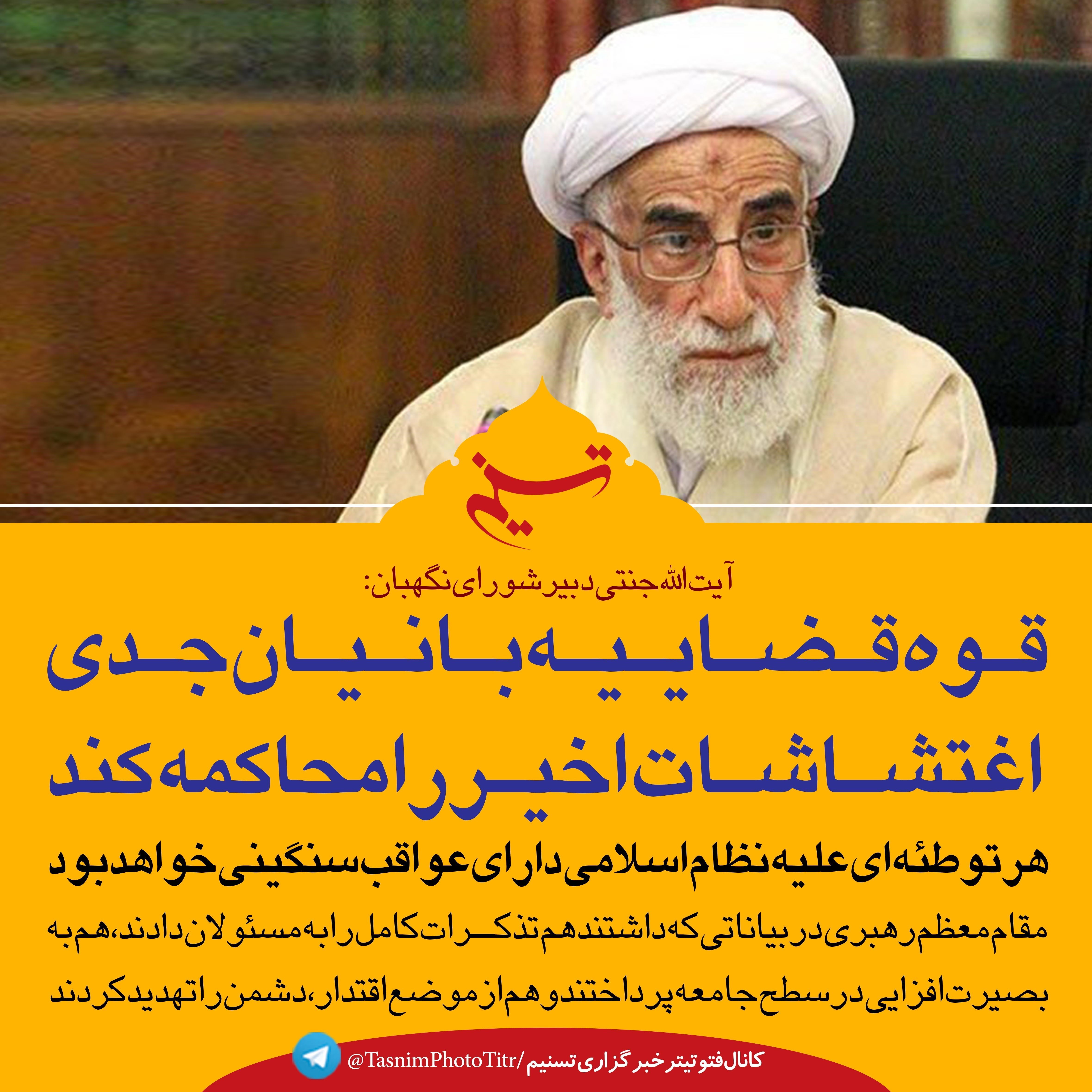 فتوتیتر/آیت الله جنتی: قوه قضاییه بانیان جدی اغتشاشات اخیر را محاکمه کند