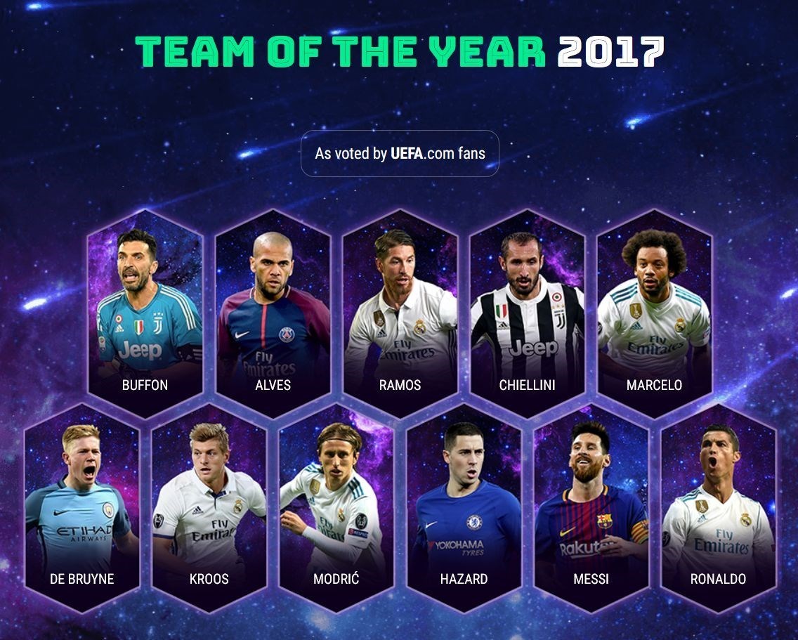 به گزارش خبرگزاری تسنیم، اتحادیه فوتبال اروپا، تیم منتخب یوفا در سال 2017 را به انتخاب هواداران و کاربران سایت رسمی خود اعلام کرد که در این بین رئال مادرید با 5 بازیکن، بیشترین سهم را دارد. نکته جالب هم اینجاست که در این تیم خبری از نیمار، گرانقیمتترین بازیکن جهان نیست.