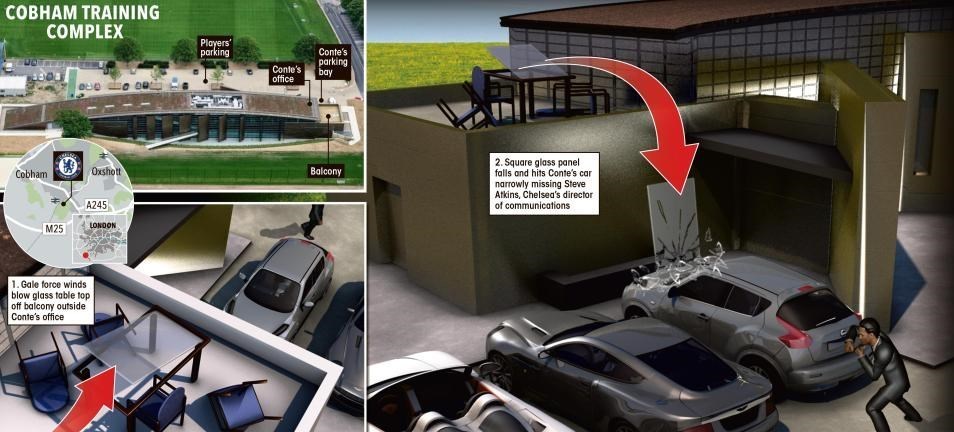 طبق گزارش سان، ورزش یک باد شدید در منطقه زمین تمرینی کوبهام باشگاه چلسی باعث میشود شیشه یک میز واقع در محوطه روباز یکی از طبقات فوقانی ساختمان این مجموعه تمرینی، بلند شده و به سمت پارکینگ باشگاه به پرواز درآید.