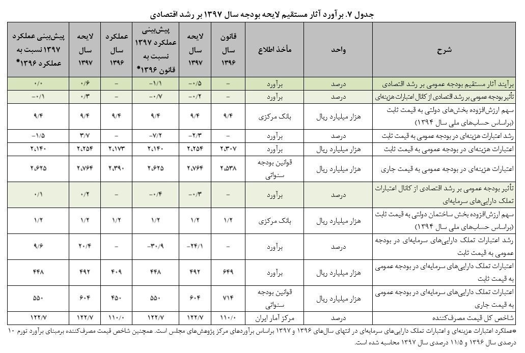 جدول 7 نشاندهنده برآوردهای مربوط به آثار مستقیم لایحه بودجه سال 1396 (اعتبارات هزینهای و اعتبارات تملک داراییهای سرمایهای) بر رشد اقتصادی سال 1396 است. برآوردهای مرکز پژوهشهای مجلس نشان میدهد که اعتبارات هزینهای و اعتبارات تملک داراییهای سرمایهای که در لایحه بودجه سال 1397 برابر با 376.4 و 60.4 هزار میلیارد تومان در نظر گرفته شدهاند، بهترتیب معادل 276 و 55 هزار میلیارد تومان محقق خواهند شد. با عنایت به نکته مذکور از یکسو و از سوی دیگر با توجه به برآوردهای مرکز پژوهشها راجع به میزان تحقق اعتبارات هزینهای و اعتبارات تملک داراییهای سرمایهای در انتهای سال 1396 (بهترتیب برابر با 239 و 45 هزار میلیارد تومان)، محاسبه نشان میدهد که: