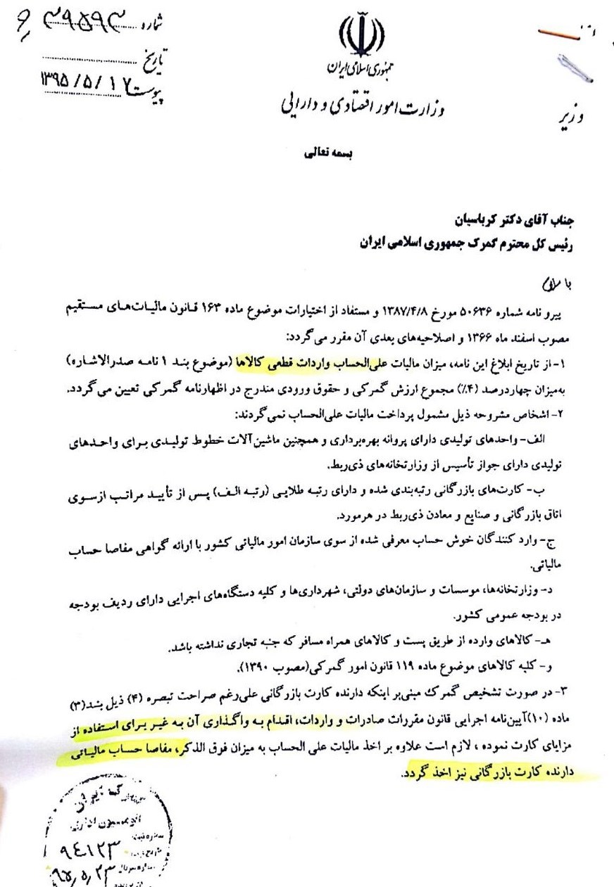 طیب نیا وزیر پیشین اقتصاد در اواخر دوران فعالیت خود در سمت وزیر امور اقتصاد و دارایی نامه مهمی را به رئیس پیشین گمرک و وزیر فعلی اقتصاد ارسال میکند که حاوی نکات جالب توجهی در خصوص وصول مالیات و مفاصا حساب از کارتهای بازرگانی یکی بار مصرف میباشد.
