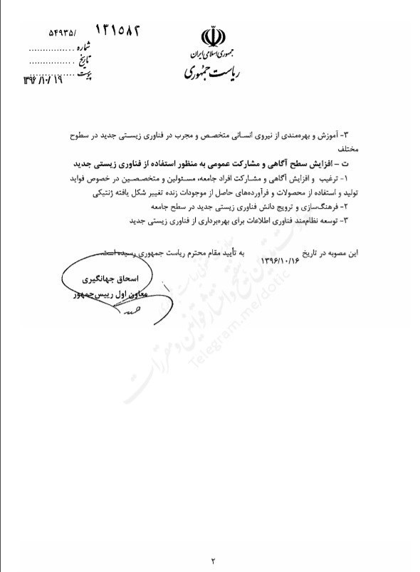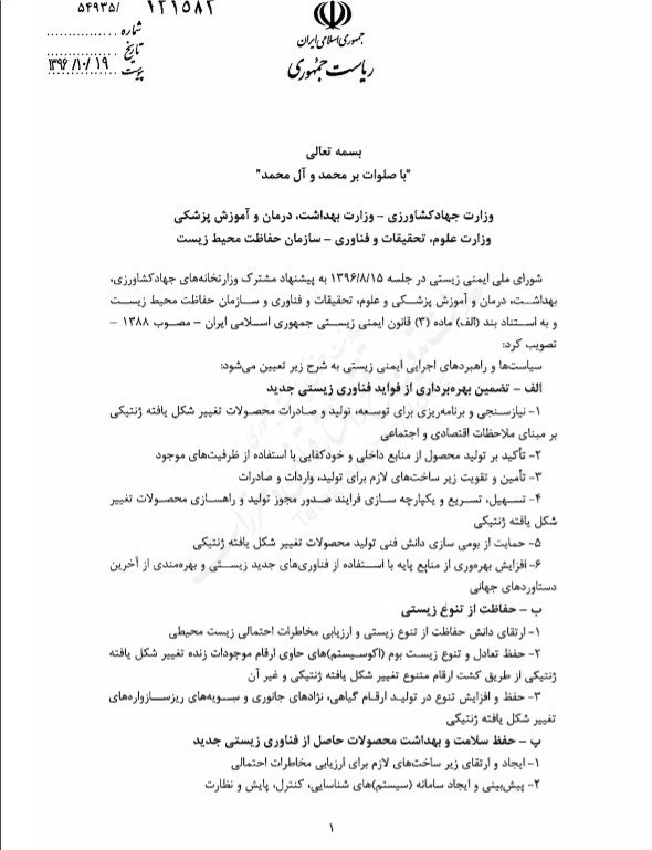 به گزارش خبرنگار اجتماعی باشگاه خبرنگاران پویا؛ اسحاق جهانگیری معاون اول رئیس‌جمهور در تاریخ 19 دی ماه سال جاری مصوبه دولت درباره «سیاست‌ها و راهبردهای اجرایی ایمنی زیستی» را به وزارتخانه‌های بهداشت، جهاد کشاورزی، وزارت علوم و سازمان محیط زیست ابلاغ کرد که در ادامه تصویر این نامه آمده است: