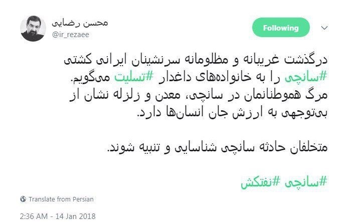 درگذشت غریبانه و مظلومانه سرنشینان ایرانی کشتی سانچی را به خانواده‌های داغدار تسلیت می‌گویم. مرگ هموطنان در سانچی، معدن و زلزله‌نشان از بی توجهی به ارزش جان انسان‌ها دارد.