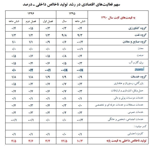 به گزارش خبرنگار اقتصادی خبرگزاری تسنیم، گزارش جدید بانک مرکزی نشان میدهد، رکود در بخش ساختمان و مسکن در ششماهه اول سال 96 همچنان حاکم بوده و سهم بخش مسکن و ساختمان از نرخ رشد 4.5درصدی کشور در این مدت صفر بوده است.