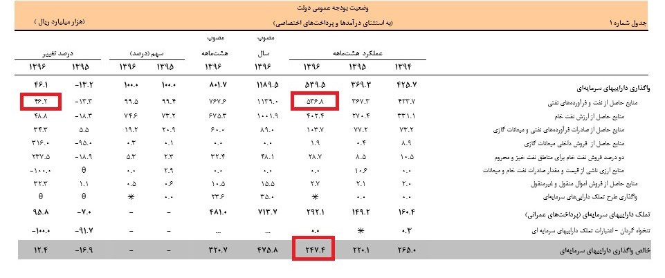 به گزارش خبرنگار اقتصادی خبرگزاری تسنیم، بررسی امارهای 8 ماهه عملکرد بودجه سال 96 نشان میدهد در این مدت منابع حاصل از واگذاری دارایی‌های سرمایه ای حدود 54 هزار میلیارد تومان بوده که 40 هزار میلیارد تومان آن از فروش نفت خام حاصل شده است.