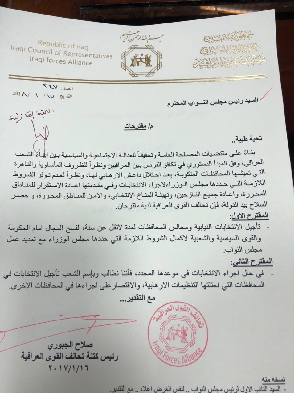 این نامه به امضای صلاح الجبوری، رئیس فراکسیون پارلمانی این ائتلاف خطاب به حیدر العبادی نگاشته شده است.