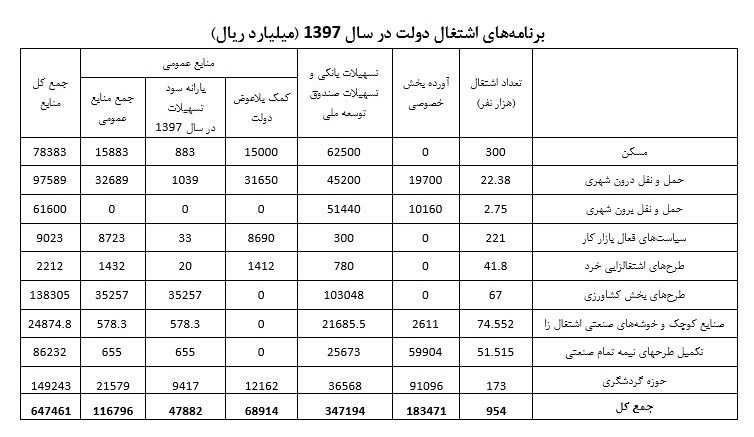 برنامه اشتغال دولت حاصل بیش از یک سال تلاش کارشناسی بدنه دولت است. ارائه برنامه اشتغال دولت در قالب تبصره 18 لایحه بودجه سال 1397، بیانگر آن است که دولت به خوبی به بحرانهای بیکاری و نیز احتمال وخیمتر شدن، واقف است. تصویر اجمالی پیشنهاد اولیه برنامه اشتغال دولت ذیل تبصره 18 با فرض در اختیار داشتن 17.4 هزار میلیارد تومان از محل اصلاح قیمت حاملهای انرژی، در کنار حدود 6 هزار میلیارد تومان پیشبینی مانده منابع قانون توسعه و ایجاد اشتغال پایدار در مناطق روستایی و عشایری در ترکیب با منابع تجهیز شده از محل تسهیلات نظام بانکی و تسهیلات صندوق توسعه ملی به شرح جدول زیر است.