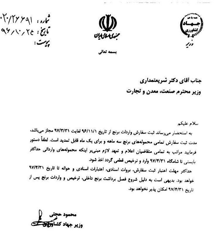 به گزارش خبرنگار اقتصادی خبرگزاری تسنیم، حجتی وزیر جهاد کشاورزی در نامهای به شریعتمداری وزیر صنعت اعلام کرد ثبت سفارش برنج از ابتدای بهمن ماه تا پایان خرداد ماه سال 97 مجاز میباشد.
