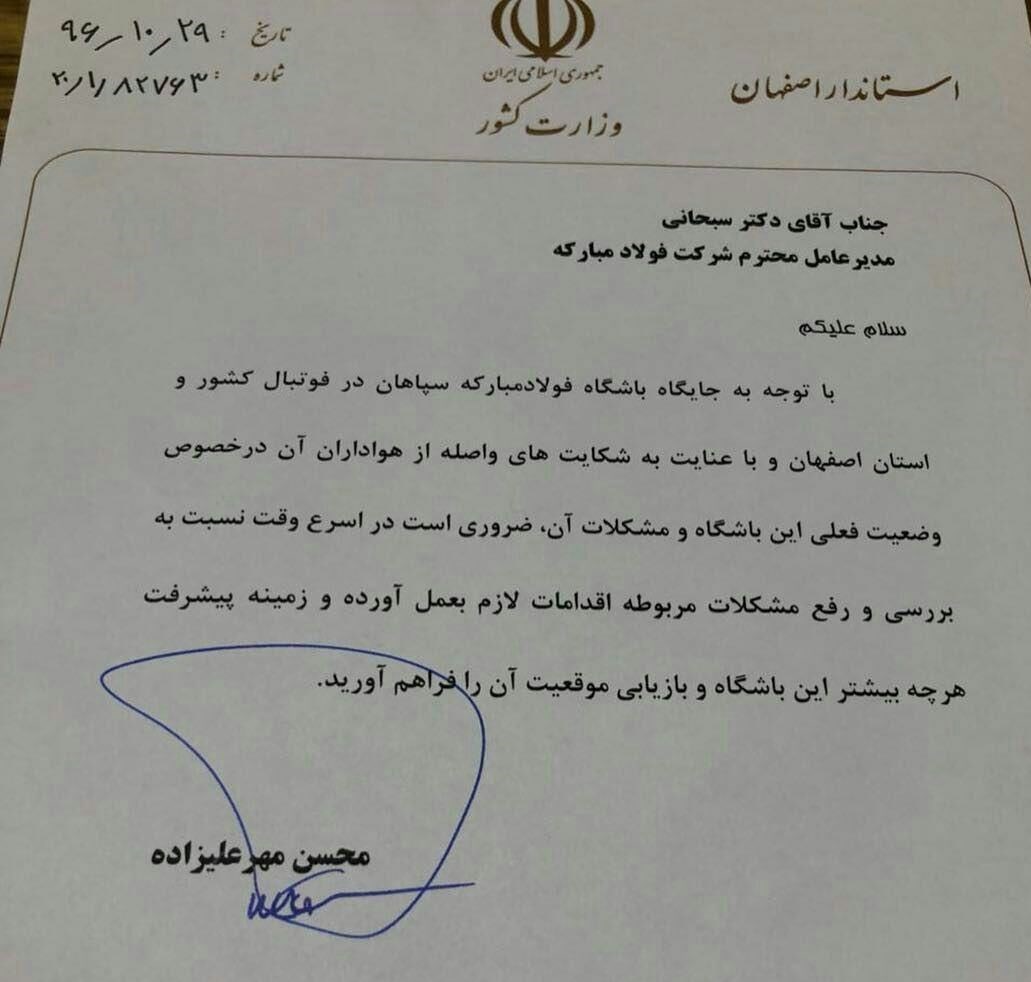 به گزارش خبرگزاری تسنیم، سپاهان امروز (جمعه) مقابل سپیدرود، هشتمین شکست فصل خود را تجربه کرد تا اوضاع این تیم در جدول وخیمتر شود. بر همین اساس، محسن مهرعلیزاده استاندار اصفهان در نامهای به بهرام سبحانی مدیرعامل کارخانه فولاد مبارکه، خواستار بررسی و رفع مشکلات زردپوشان اصفهانی شد.