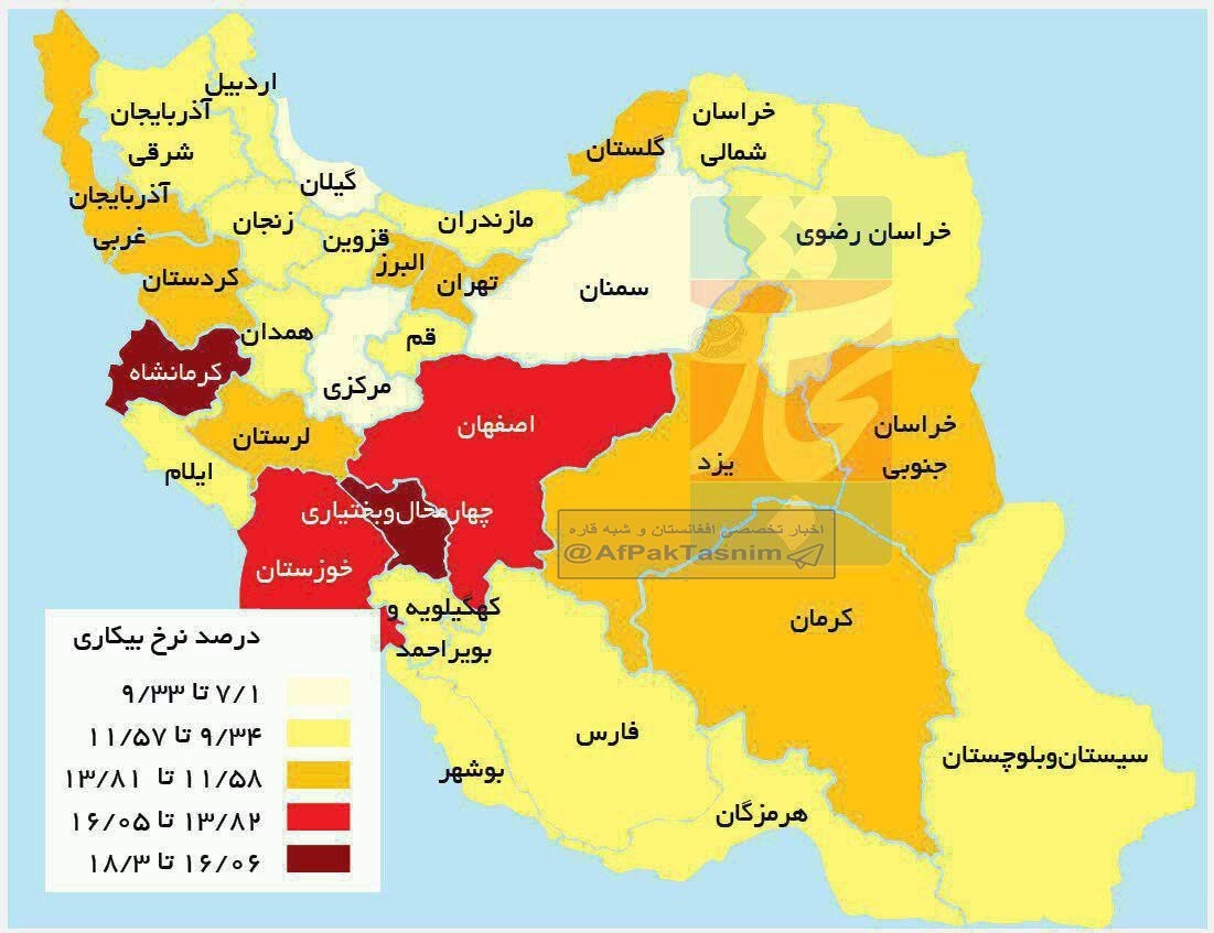 همچنین در نقشه ذیل هم مشاهده میکنید که «چهارمحال بختیاری» و «کرمانشاه» بیشترین آمار بیکاری را در کشور به خود اختصاص دادهاند، همچنین آمار بیکاری در سایر استانهای مهاجرپذیر نظیر «خراسانرضوی»، «قم»، «فارس» و «همدان» بحرانی نبوده و در قیاس با سایر استانها نرخ بیکاری کمتری را شاهد است.