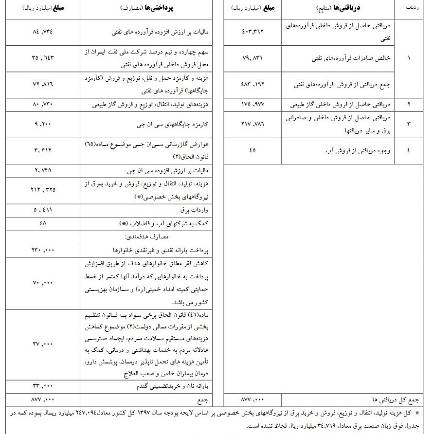 در بخش مصارف نیز 8.4 هزار میلیارد بابت مالیات ارزش افزوده فرآوردههای نفتی، 7.2 هزار میلیارد تومان بابت هزینه و کارمزد حملونقل فرآوردههای نفتی، 8هزار میلیارد بابت هزینه تولید و انتقال گاز و 500 میلیارد تومان هزینه واردات برق لحاظ شده است.